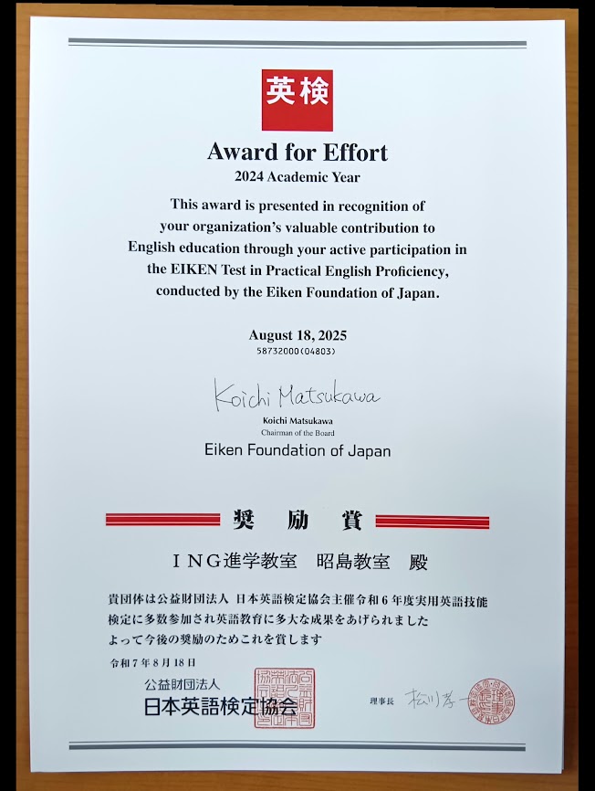 また、昨年度の昭島教室の英語検定の取り組みが評価され、